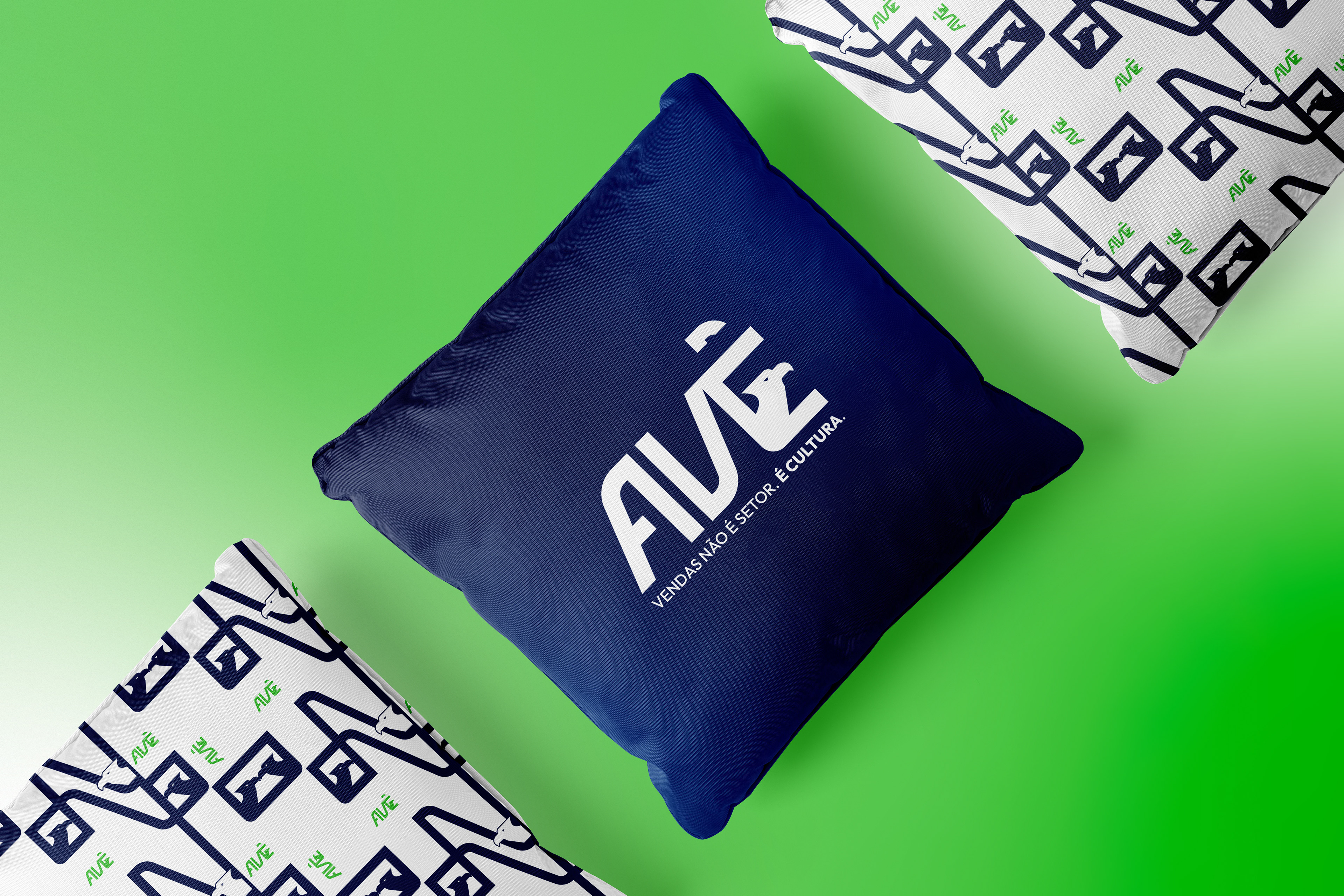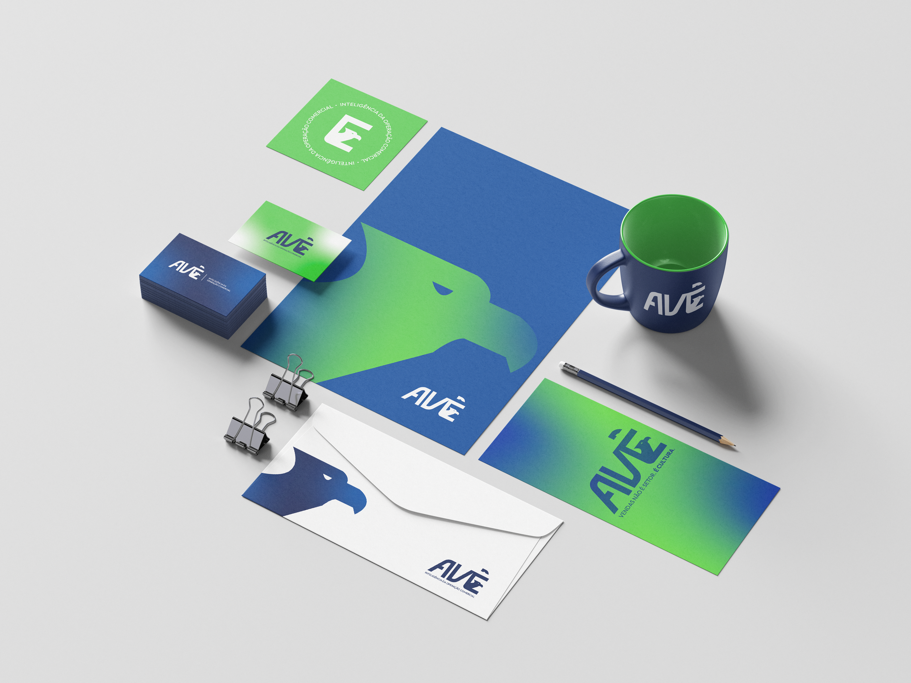 A paleta de cores reforça o conceito: o azul profundo transmite autoridade e estabilidade; o azul intermediário adiciona confiança e modernidade; o verde simboliza crescimento estruturado; e o branco garante clareza e equilíbrio visual. A combinação cria uma estética corporativa contemporânea, coerente e alinhada ao posicionamento estratégico da AVÊ.
