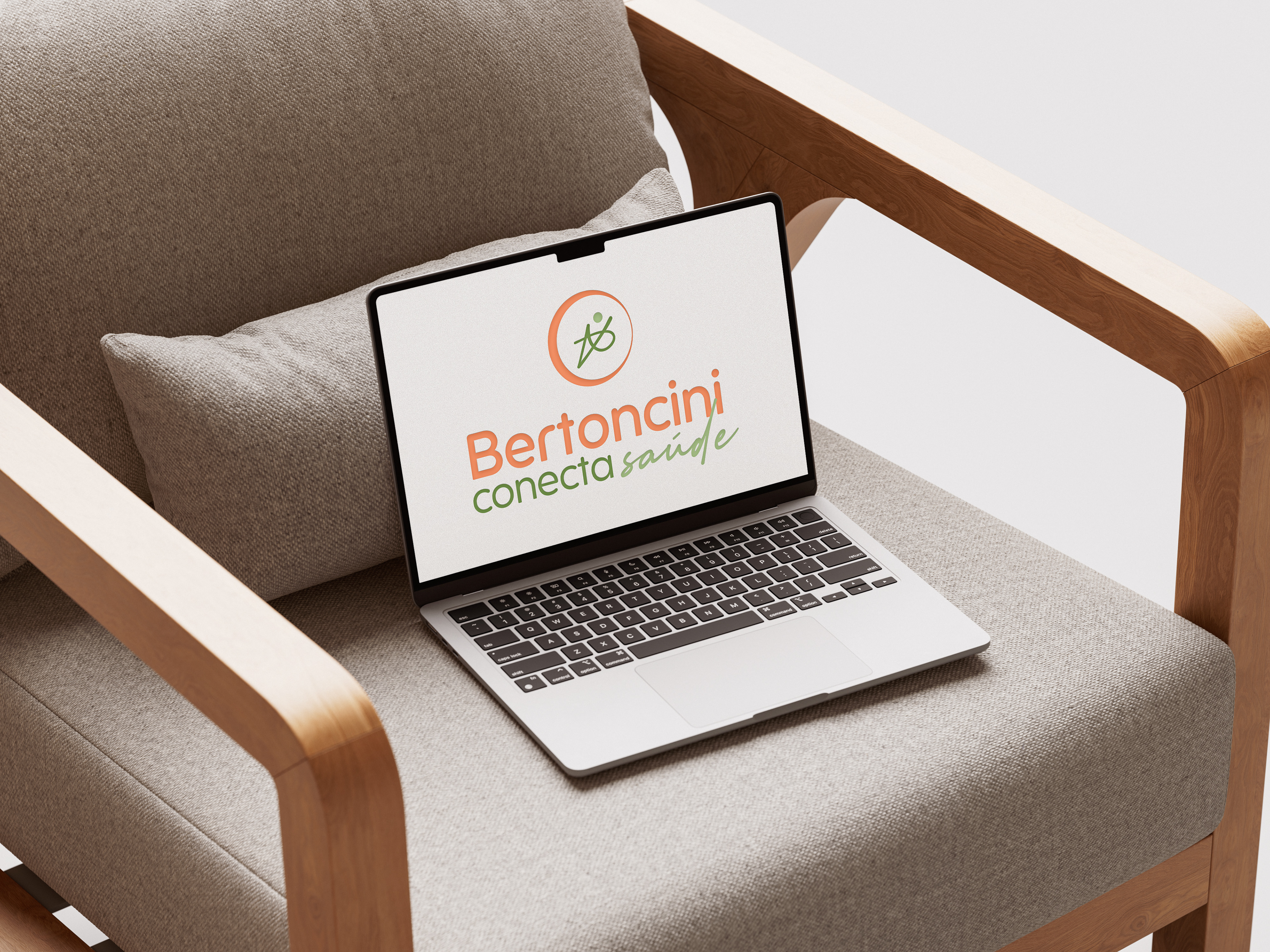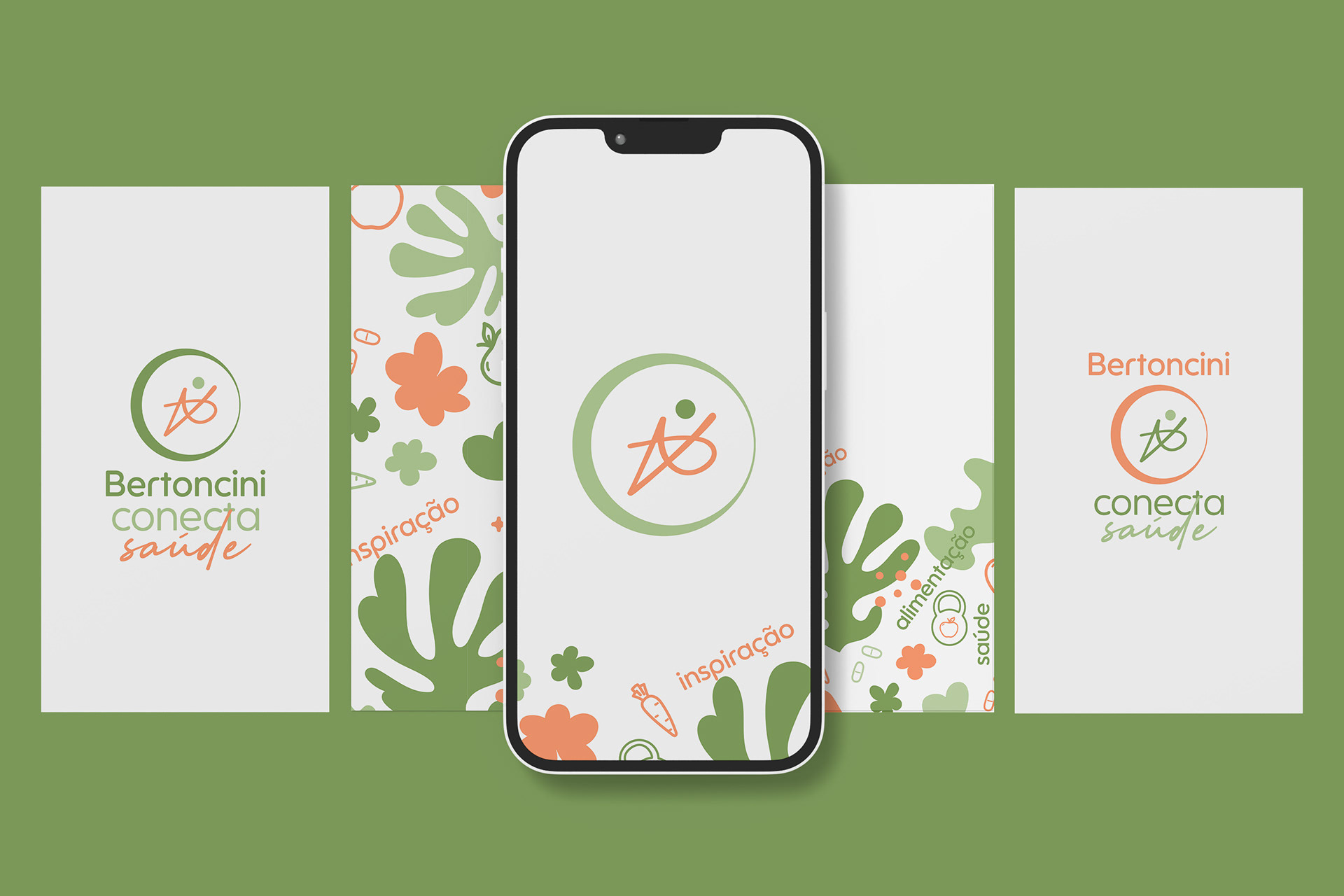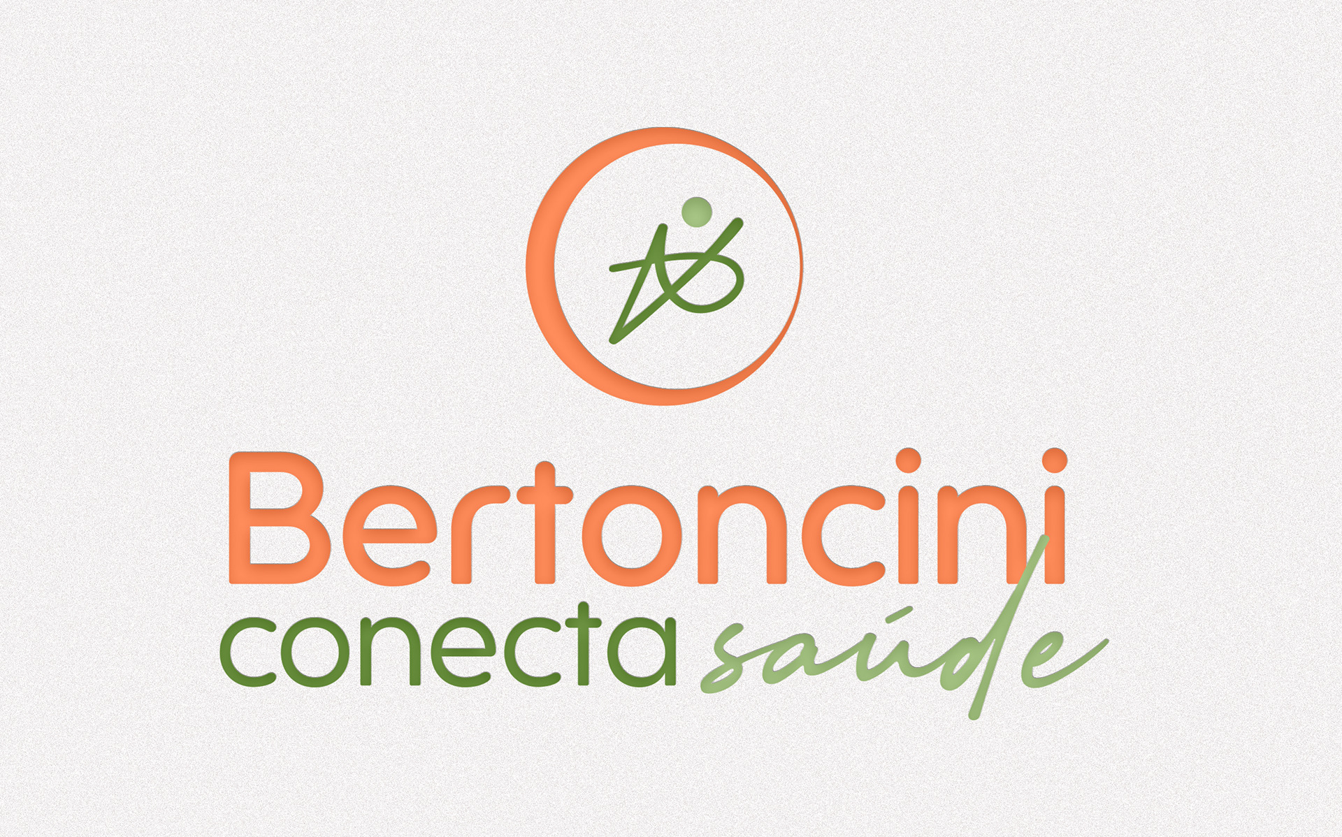 A tipografia equilibra força e acolhimento: Bertoncini conecta em letras arredondadas, transmitindo proximidade, e Saúde em cursiva, reforçando o lado humano. A paleta em verdes e laranja terroso traz os conceitos de confiança, equilíbrio, energia e transformação, enquanto o branco garante clareza e leveza.