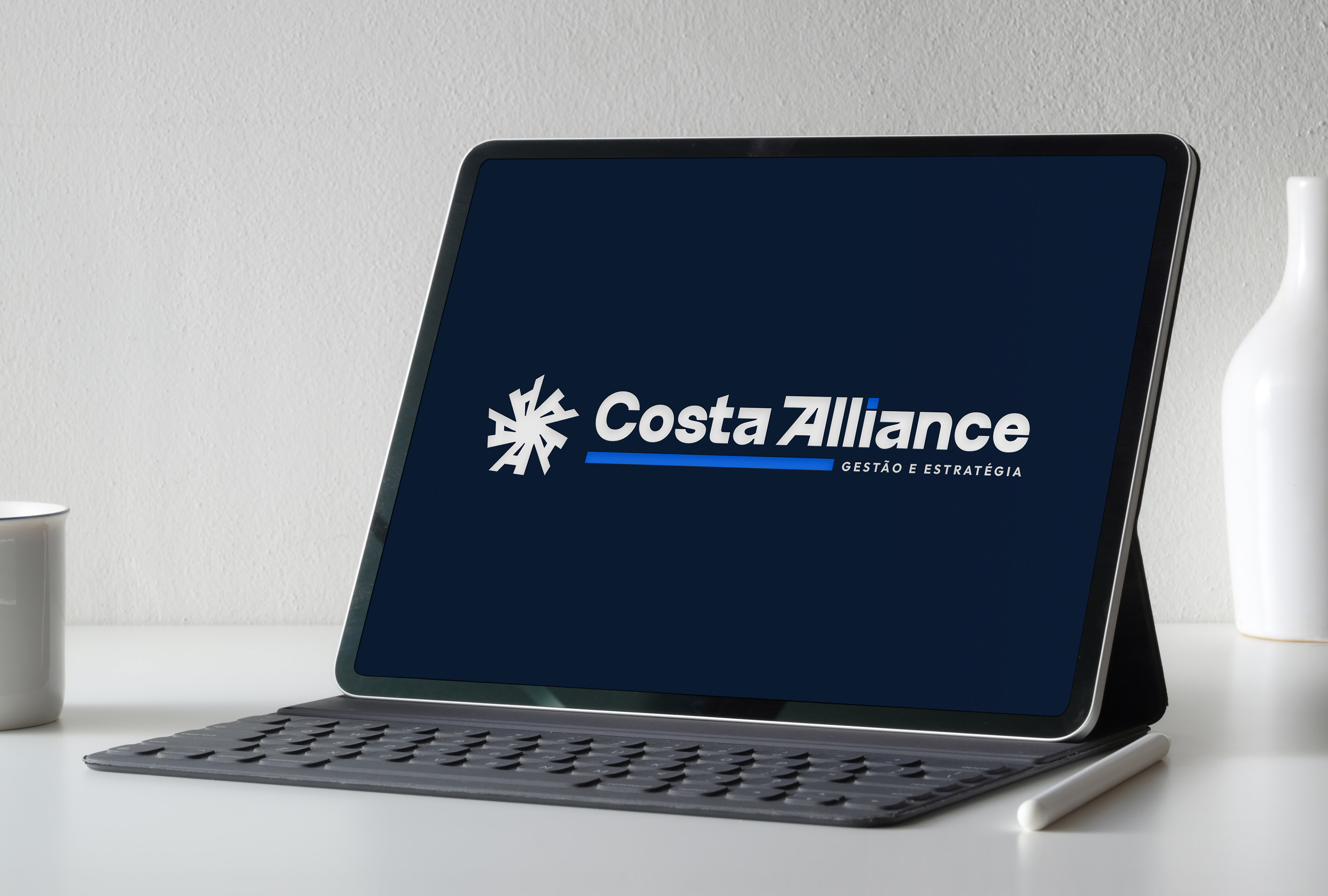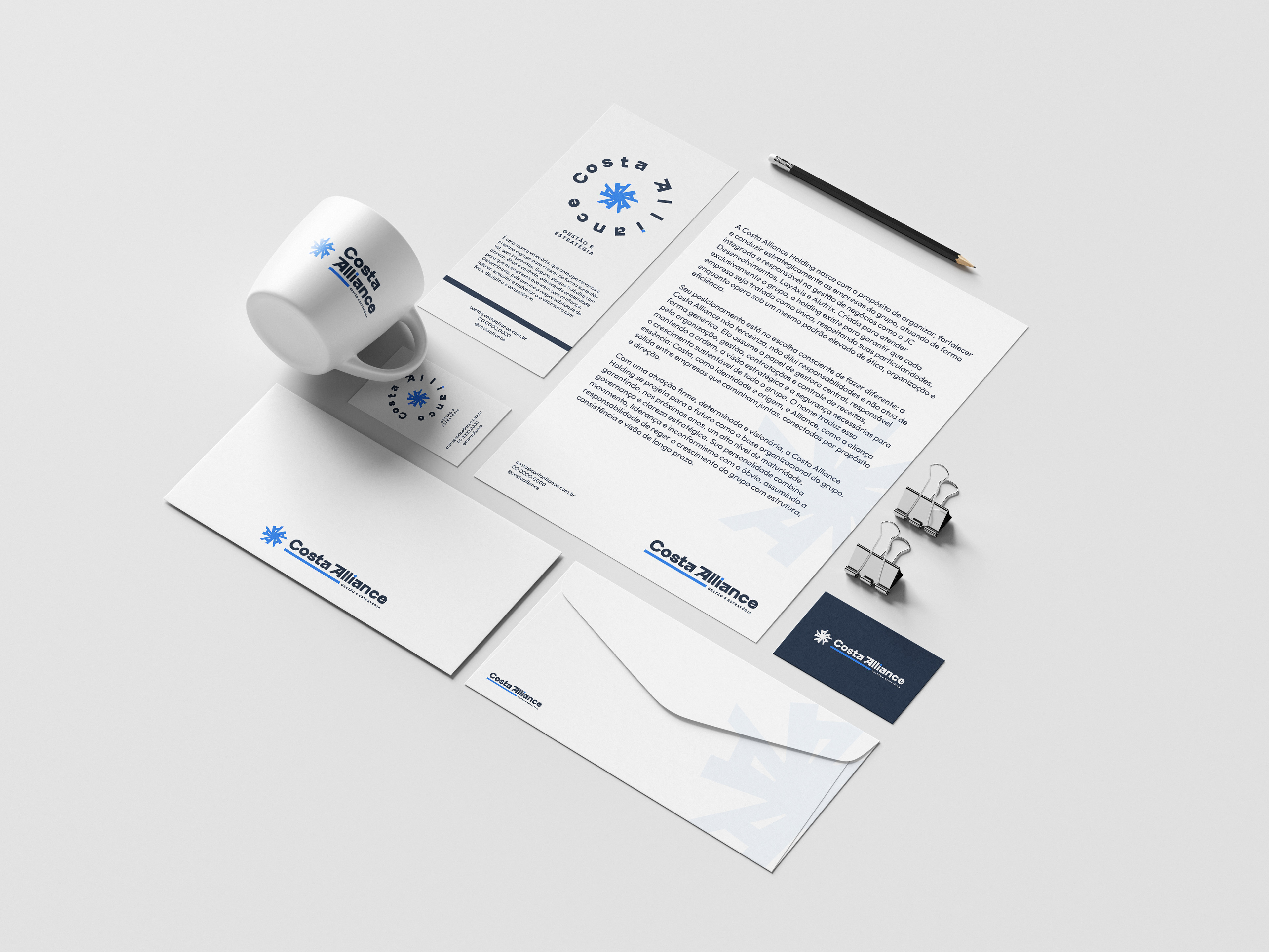 Todo o processo foi guiado por atributos claros: visionária, segura e determinada, garantindo uma identidade coerente, estratégica e atemporal. O resultado é uma marca sólida, flexível e consciente do seu papel, capaz de se adaptar a diferentes aplicações sem perder força, e que traduz visualmente a Costa Alliance como aquilo que ela é: a estrutura que rege, conecta e impulsiona o crescimento do Grupo Costa.