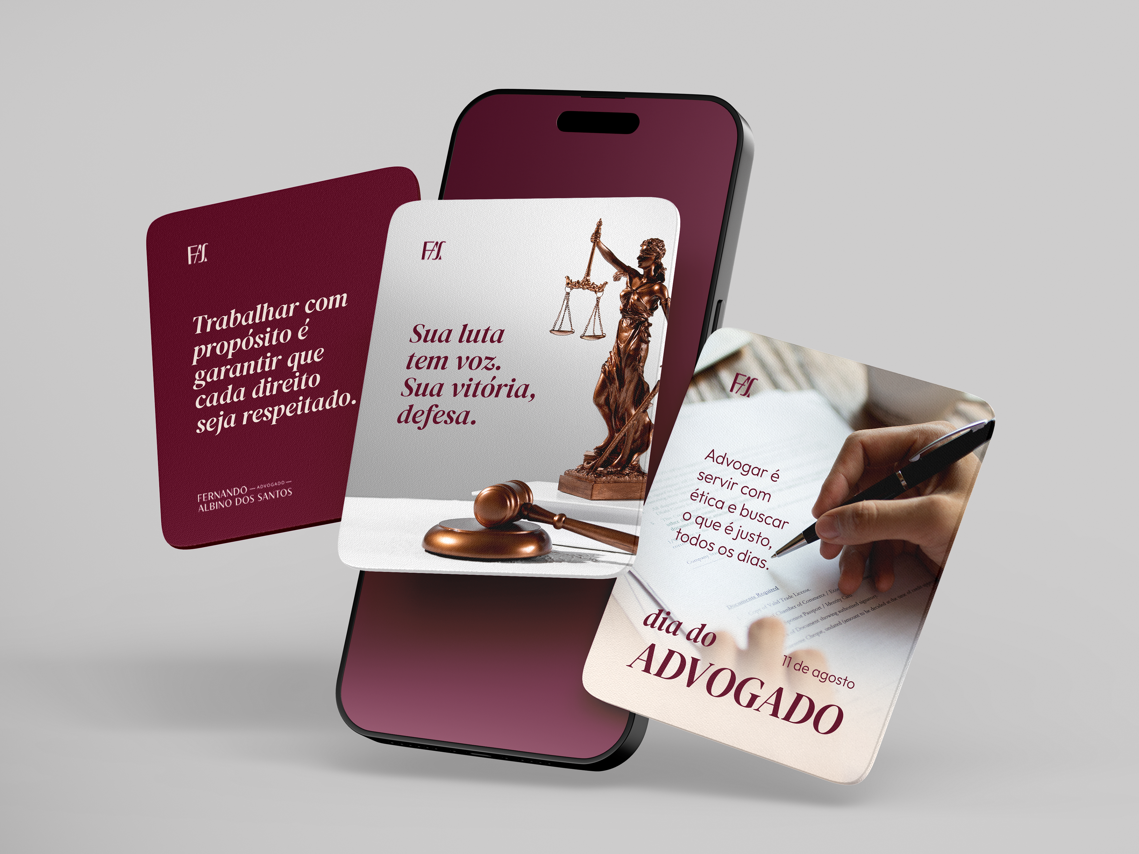 Todo o projeto foi pensado para comunicar profissionalismo sem perder o lado humano que distingue a atuação do advogado. O resultado é uma marca forte, coerente e preparada para representar Fernando Albino dos Santos em todas as suas frentes de comunicação, fortalecendo sua presença no mercado e transmitindo confiança desde o primeiro contato.